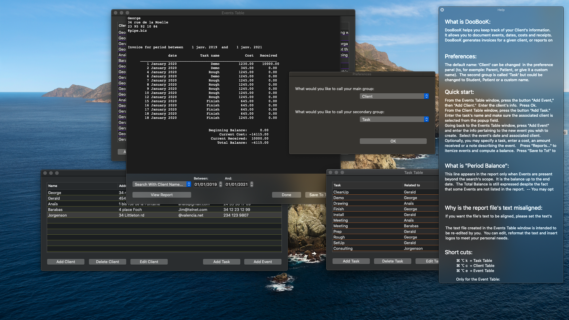 From the Events Table window, press the button "Add Event," then "Add Client." Enter the client's info. Press Ok. From the Client Table window, press the button "Add Task." Enter the task's name and make sure the associated client is selected from the popup field. Going back to the Events Table window, press "Add Event" and enter the info pertaining to the new event you wish to create. Select the event's date and associated client. Optionally, you may specify a task, enter a cost, an amount received or a note describing the event. Press "Reports..." to itemize events and compute a balance. Press "Save" to generate an invoice on the location of your choice.